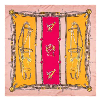 33" x 34" scarf in printed silk twill depicting equestrian tack on pink & yellow backgrounds. Hand-rolled and stitched edges.
