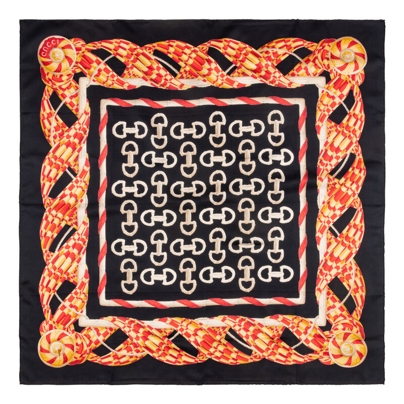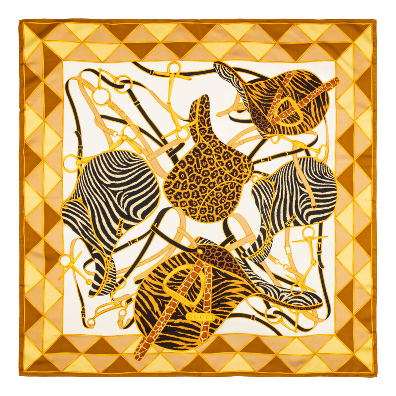 34" x 34" scarf in printed silk twill depicting exotic skin saddles on a geometric background. Hand-rolled and stitched edges.