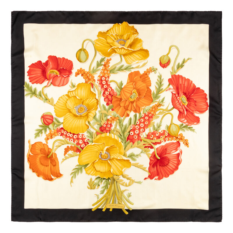 34" x 34" scarf in printed silk twill depicting a floral bouquet on a white background & black border. Hand-rolled and stitched edges.