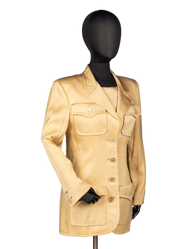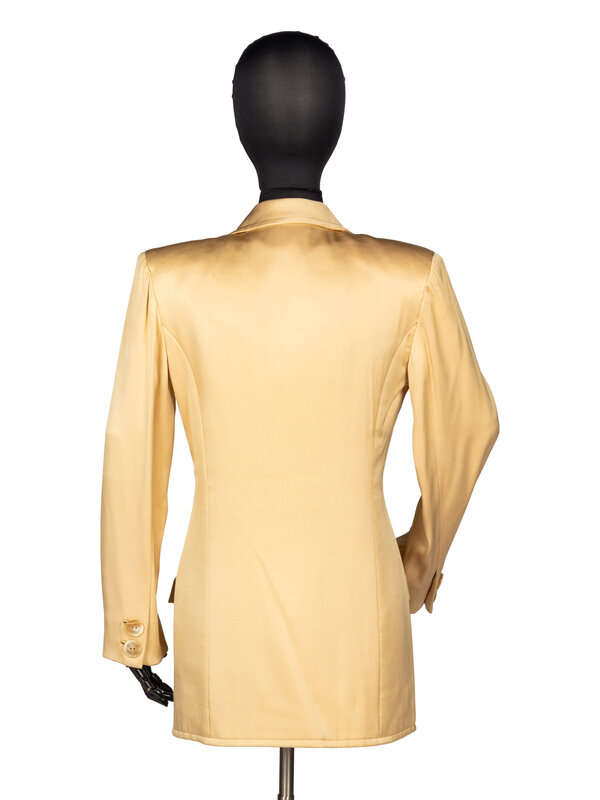 Jacket in champagne silk satin. Notched collar & lapels. Four patch pockets with buttoned flaps at front. Padding at shoulders. Full length sleeves with decorative buttons at sleeve hems. Button closures at front. Fully lined in champagne silk habotai.