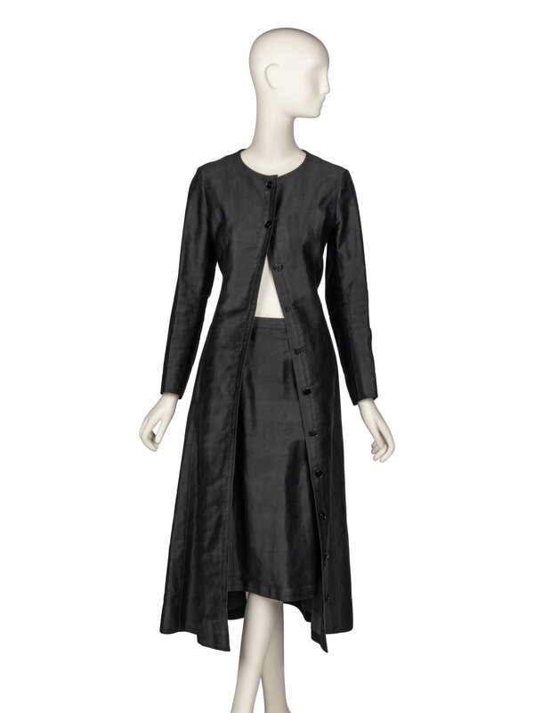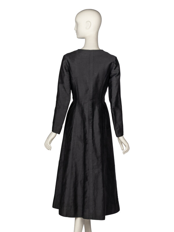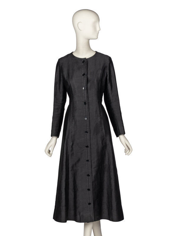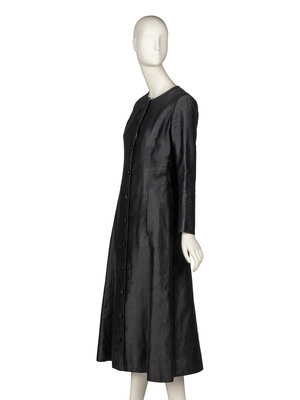 Overcoat/dress in black satin-weave cotton. Collarless, round neckline. Long sleeves. Slightly flared silhouette. Two in-seam pockets at front. Button closures at front. Fully lined.
