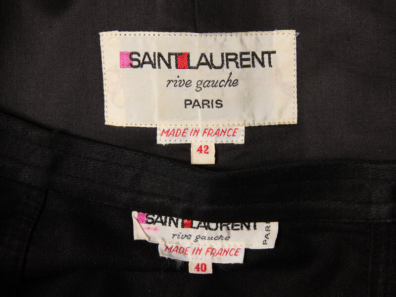 Knee length A-line skirt in black satin weave cotton. Piecing with lapped seams & topstitching throughout. Zipper and hook-and-eye closures at side waist. Unlined.