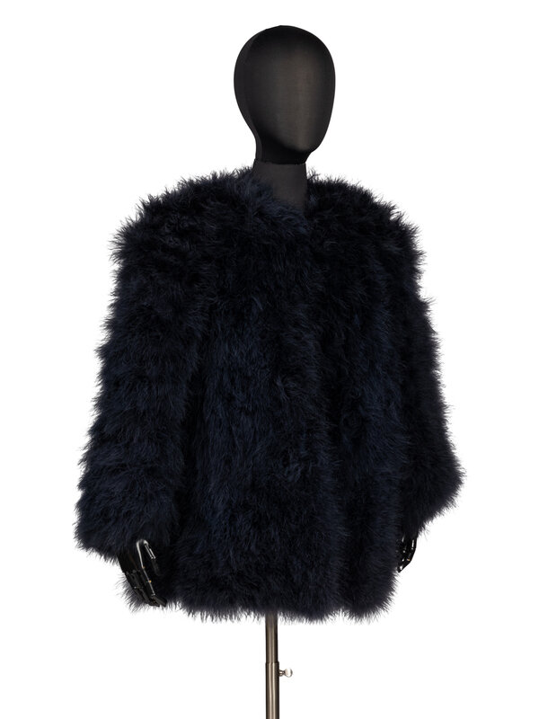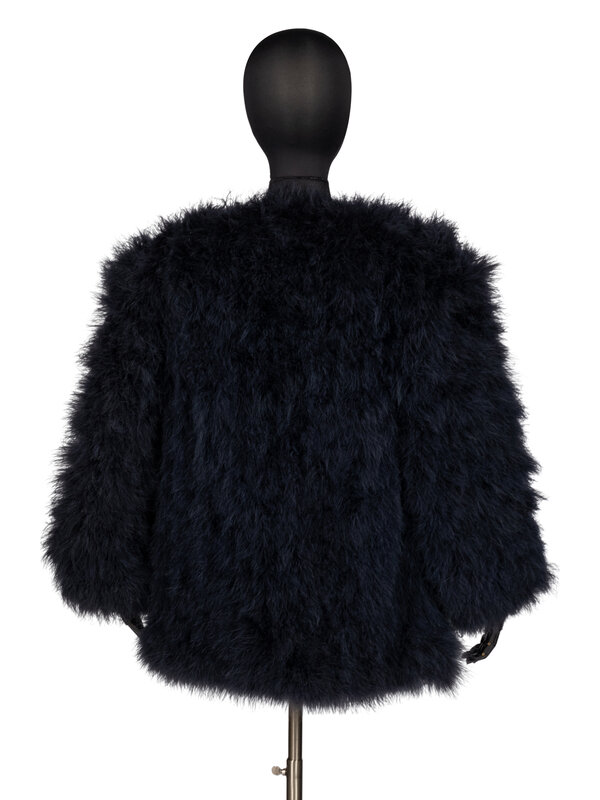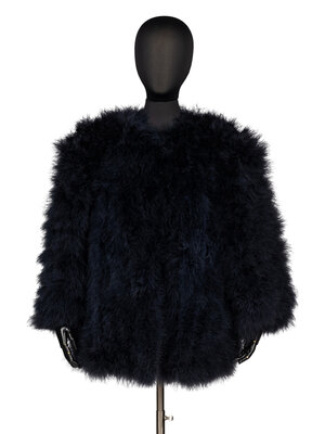 Blue feather jacket lined in blue silk, single hook and eye clousure.