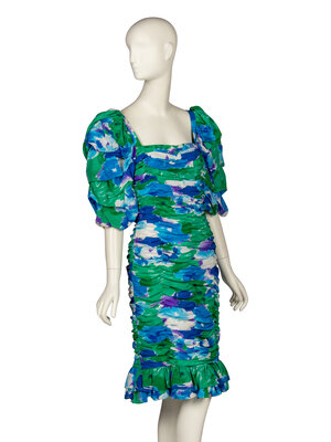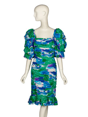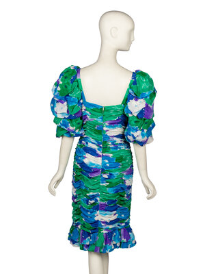 Knee-length cocktail dress in printed silk habotai with heavy ruching throughout. Square neckline. Elbow-length puff sleeves with ruching. Ruffles at hem. Zipper closure at back. Fully lined.