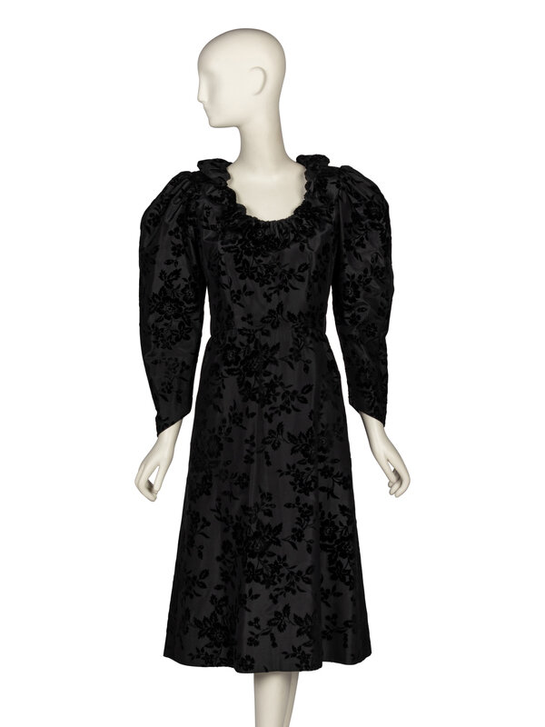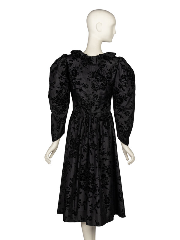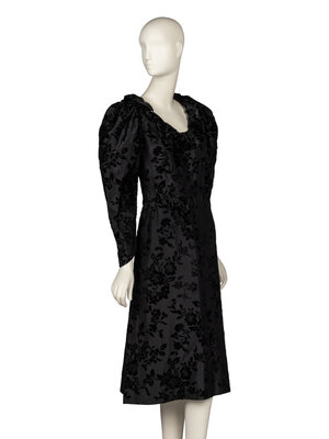 Cocktail dress in black floral ciselé velvet. Fitted bodice with padding at shoulders. Round scoop neckline with ruffle trim/collar. Wrist length leg-of-mutton sleeves with pointed sleeve hems. Midi length A-line skirt. Concealed zipper and hook-and-eye closures at back. Unlined.