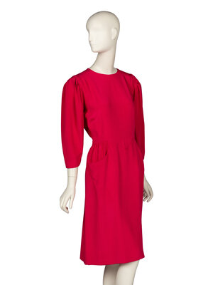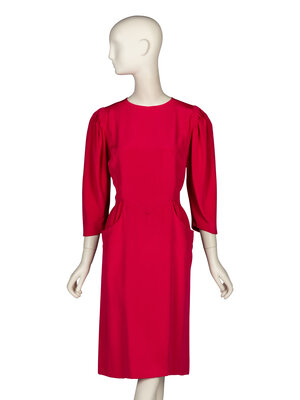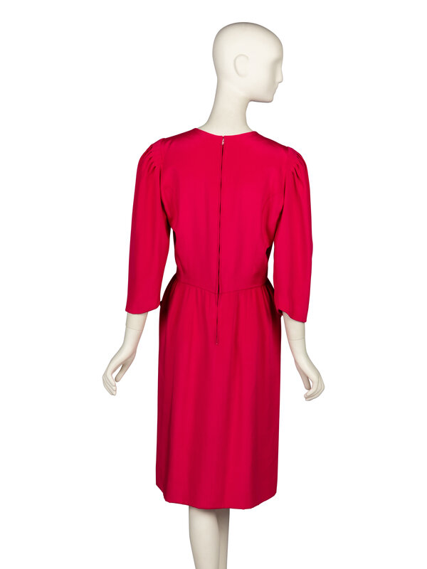 Dress in shocking pink silk crêpe de chine. Round collarless neckline. Three-quarter length sleeves with gathered sleeve heads. Shaped waist section with built in pockets at hips. Knee-length straight skirt. Concealed zipper closure at back bodice. Fully lined.