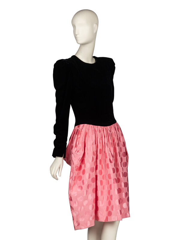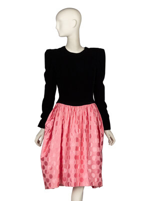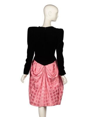Cocktail dress in black acetate/rayon-blend velvet; cotton-blend pink faille jacquard with a polka dot pattern. Round collarless neckline. Fitted bodice with padded shoulders. Leg-of-mutton sleeves with reinforced sleeve heads and zipper closures at sleeve hems. Knee length gathered skirt with draped details at back. Fully lined in tonal china silk.