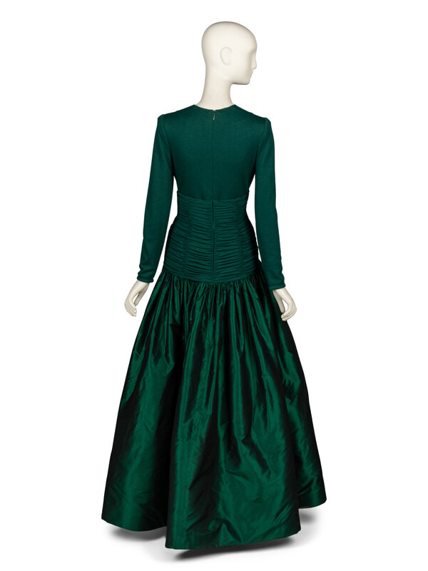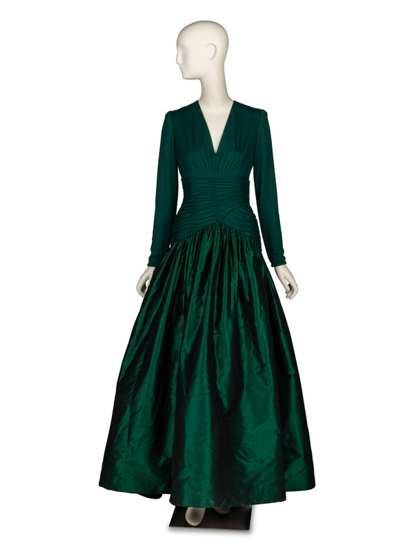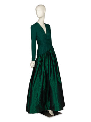 Evening gown in emerald green wool knit jersey & emerald green shot silk taffeta. V neckline. Draped bodice with horizontal ruching at midsection; light boning throughout midsection. Floor-length gathered full skirt with horsehair trim bands at interior hem. Invisible zipper and hook-and-eye closures at back bodice. Partially lined.