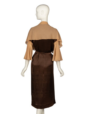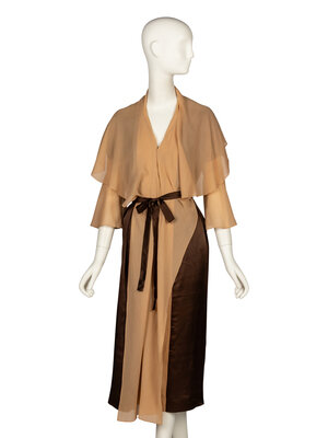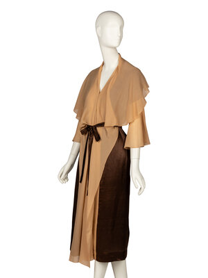 Knee-length chemise in beige silk chiffon and brown silk charmeuse. Straight-cut bodice with drop sleeves & godets at underarms. V neckline. Elbow-length sleeves. Circular flounces at sleeve hems. Draped capelet & shawl at front of dress. Includes detached self-fabric belt.