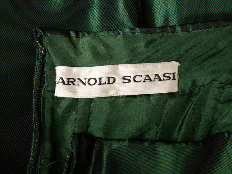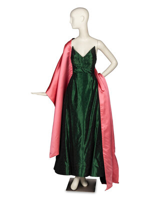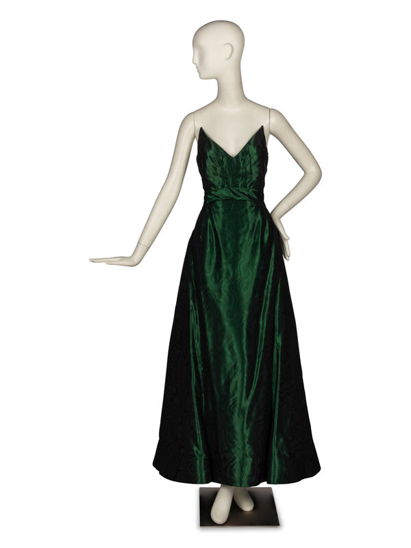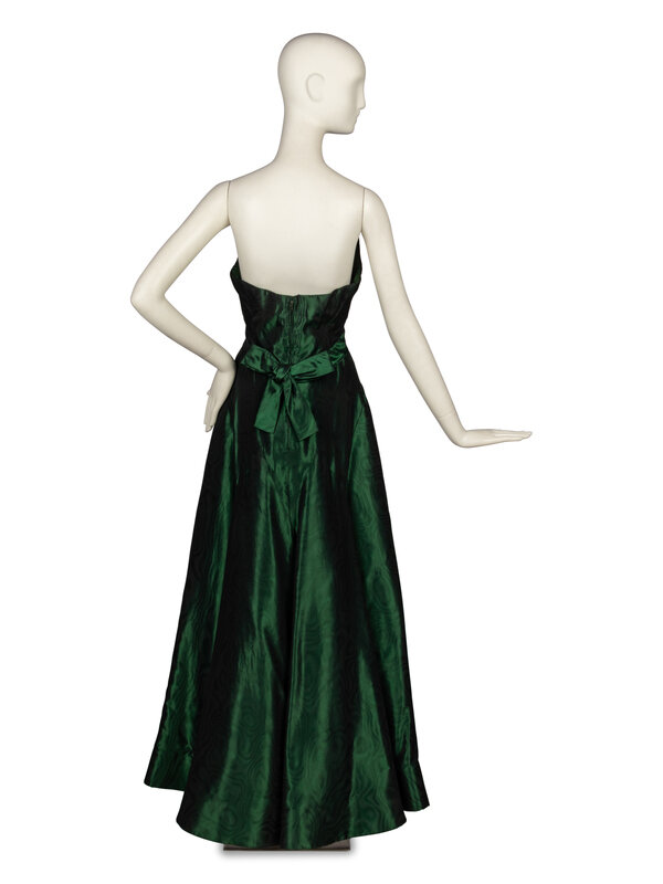 Evening gown in emerald green shot silk with a moiré effect. Strapless with a pointed sweetheart neckline. Boned bodice with light padding at bust. Decorative bow at back waist. Full ankle-length skirt with stiffened crinoline structuring underneath. Zipper and hook-and-eye closures at back. Fully lined.