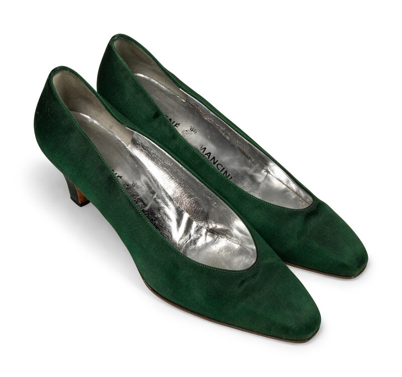 Square-toe pumps in emerald green silk satin. Lined in metallic silver leather.