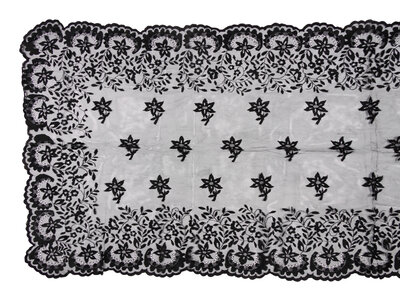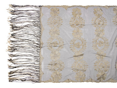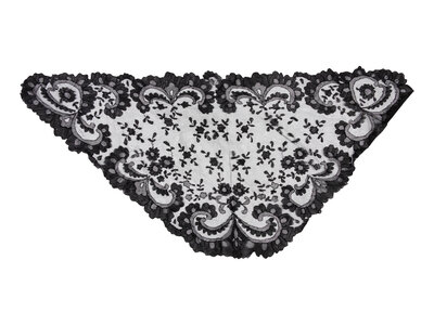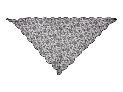 Lace shawl in black & silver metallic threads with long fringe on both ends.