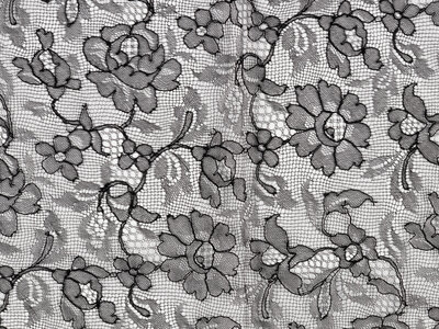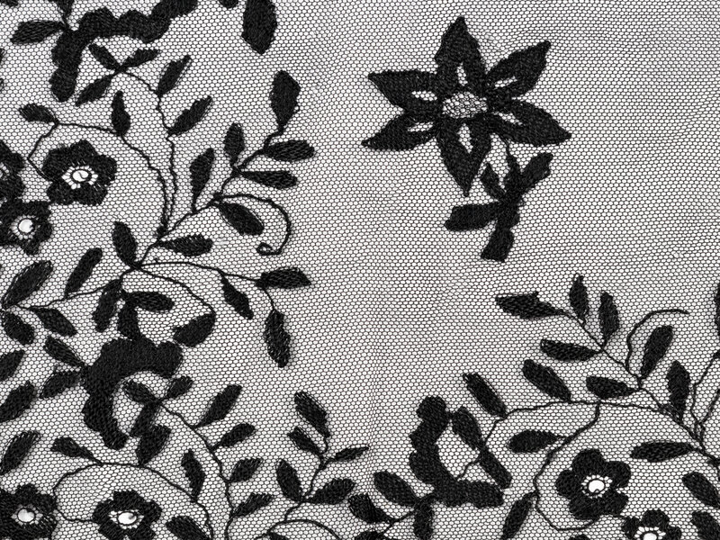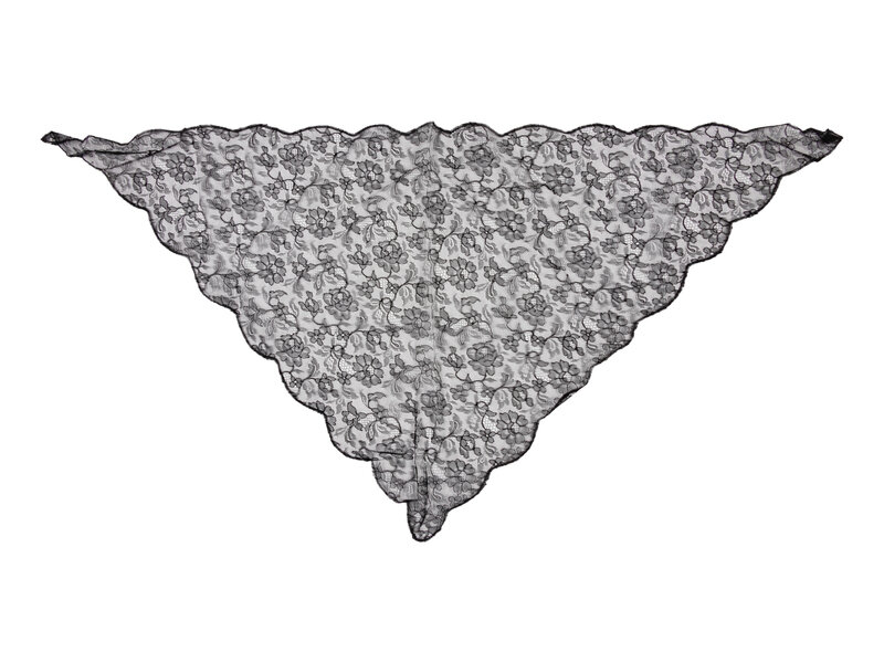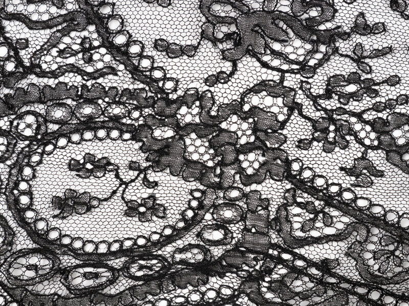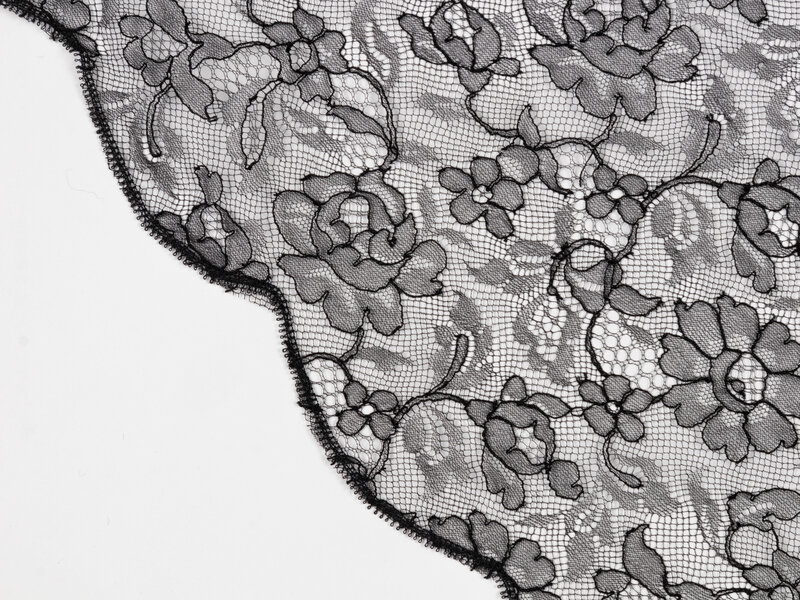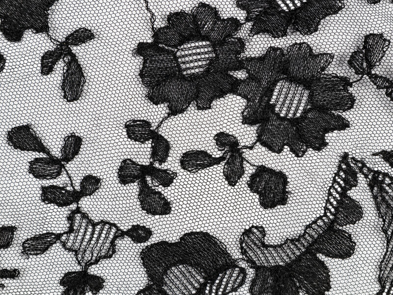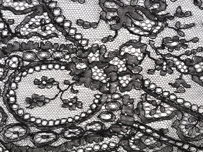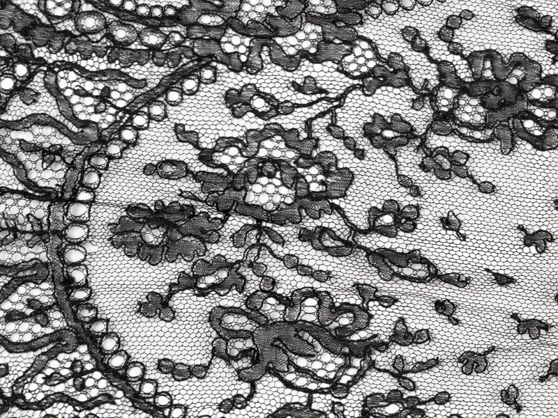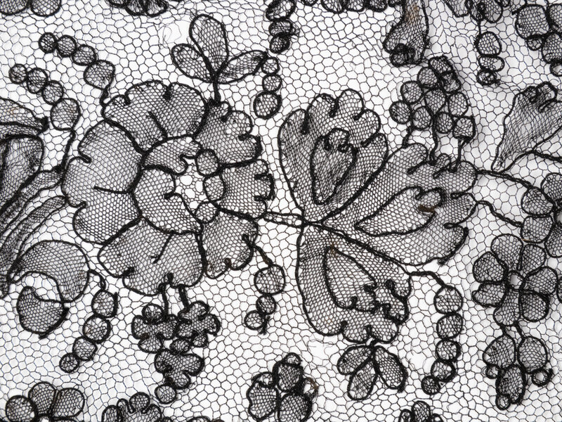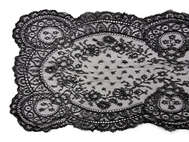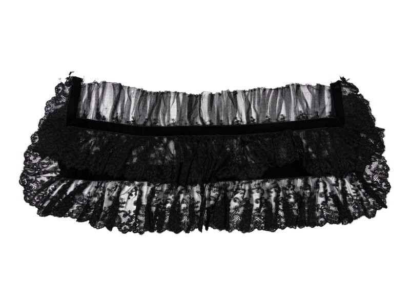 Sample of ruffles of black lace with black velvet ribbon trim; likely removed from a garment.