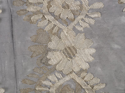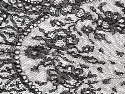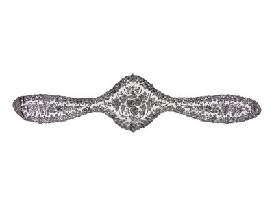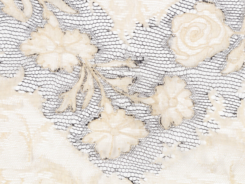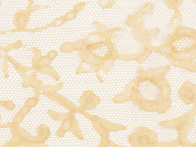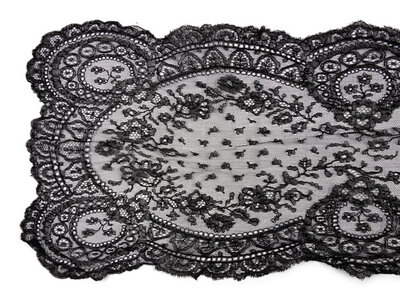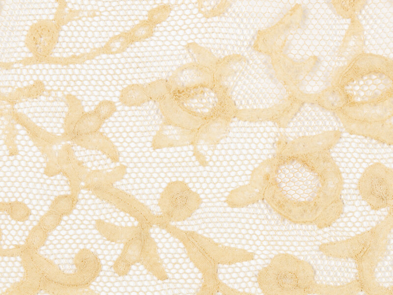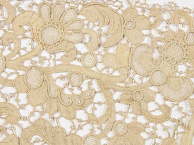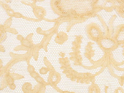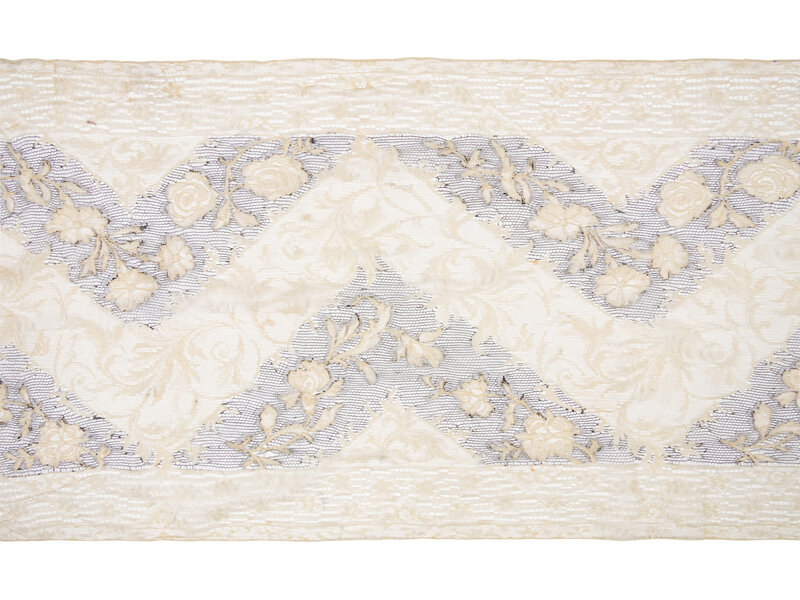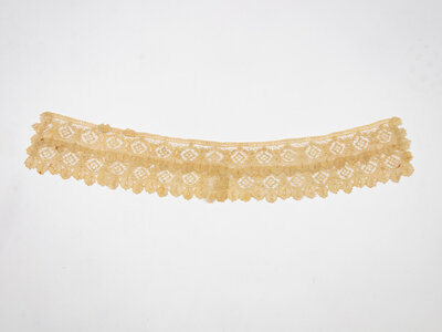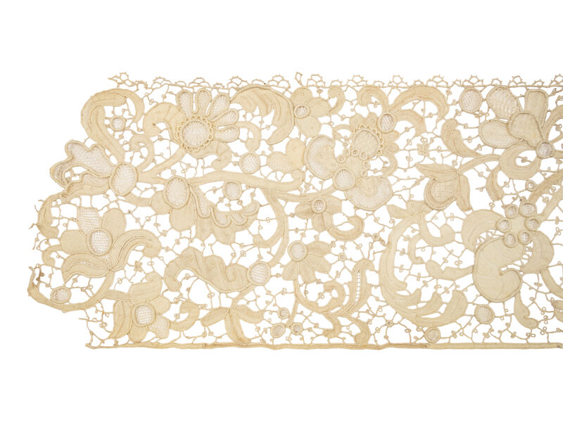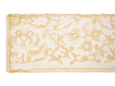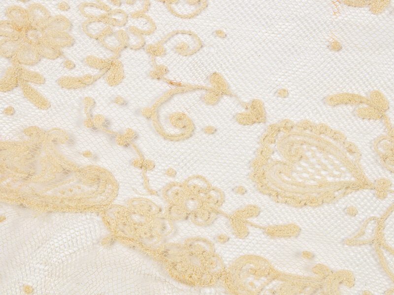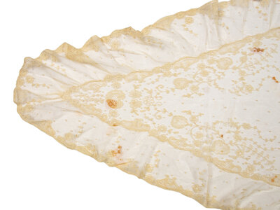 Oblong panel of cream-colored lace with slightly ruffled edges.
