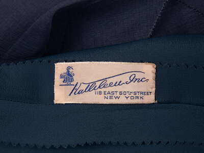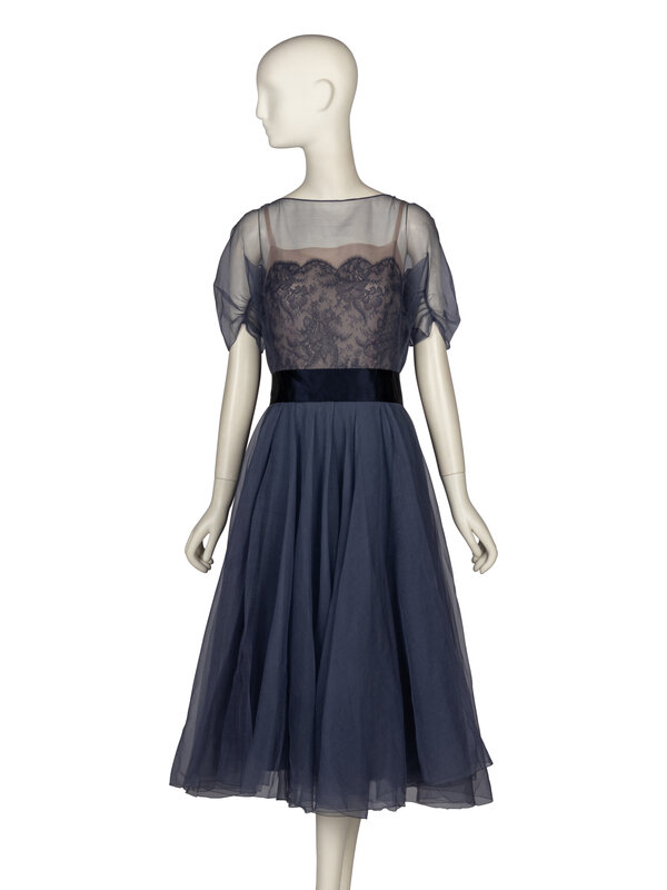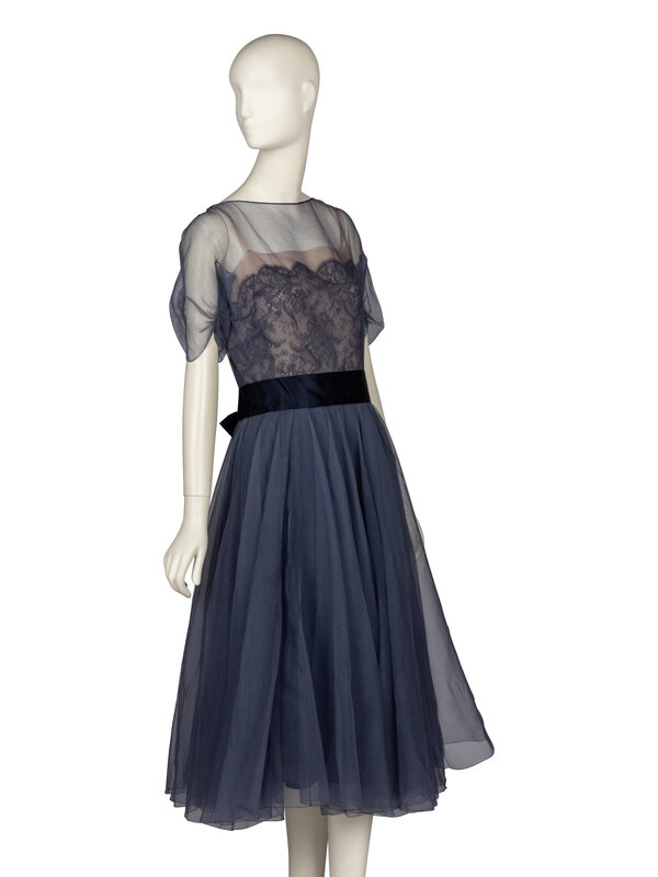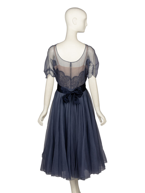 Cocktail dress in blue organza. Wide, collarless neckline; scoops lower at back. Short sleeves with decorative gathers. Features underlayer spaghetti strap bodice in blue lace & beige organza. Navy satin ribbon waistband with bow at back. Midi-length layered circle skirt. Zipper and snap closures at side bodice. Fully lined.