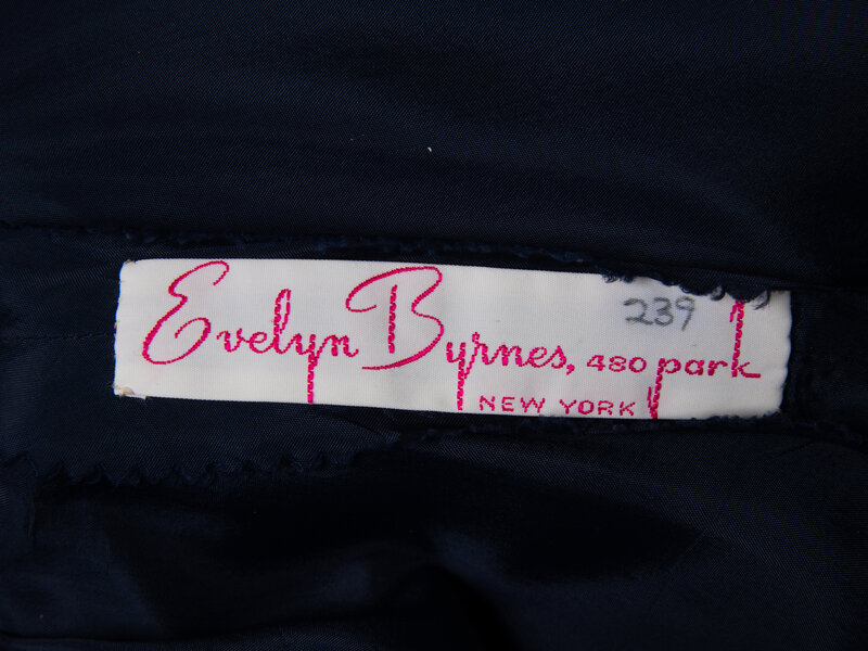 Halter neck evening gown in navy silk chiffon and satin. V-neckline with chiffon capelet. Full-length layered skirt. Hook-and-eye closures at back neck; zipper and hook-and-eye closures at back bodice. Fully lined.