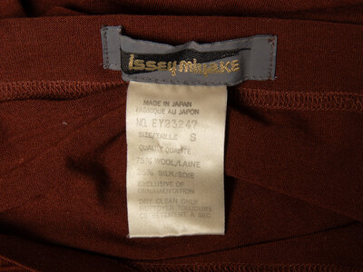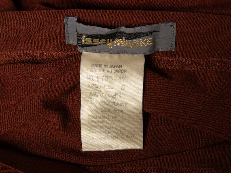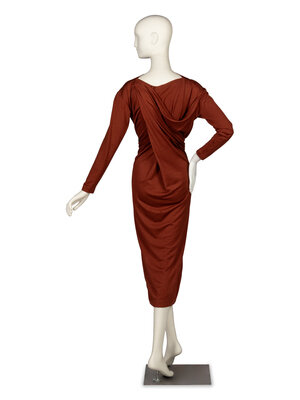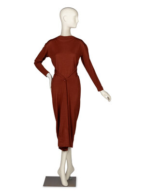 Midi length shift dress in rust-colored wool/silk-blend jersey knit. Bateau neckline; dropped shoulders and full length long sleeves. Draped & layered neckline at back. Features button and buttonhole at waist to create a "cinched" waistline effect when buttoned. Unlined.