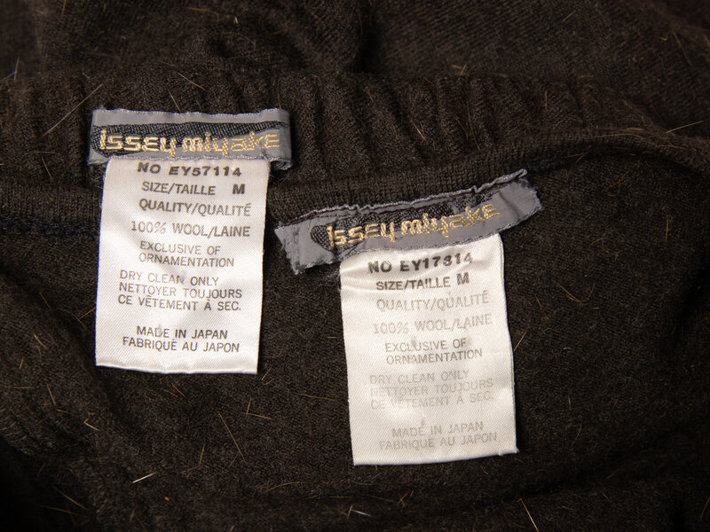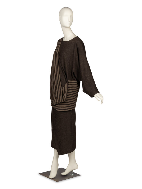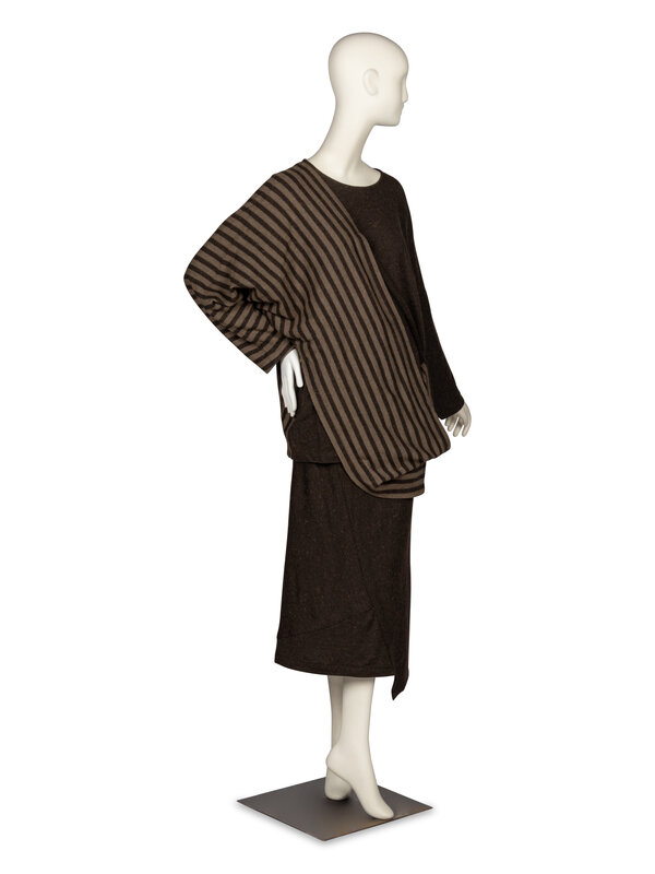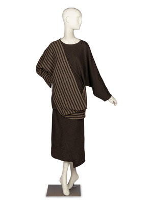 Tunic in heathered brown wool jersey knit and striped brown wool jersey knit. Wide, round neckline. Dolman sleeves. Draped element at front of tunic. Unlined.