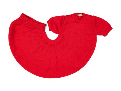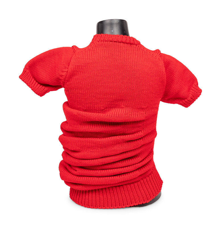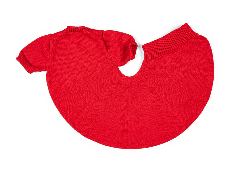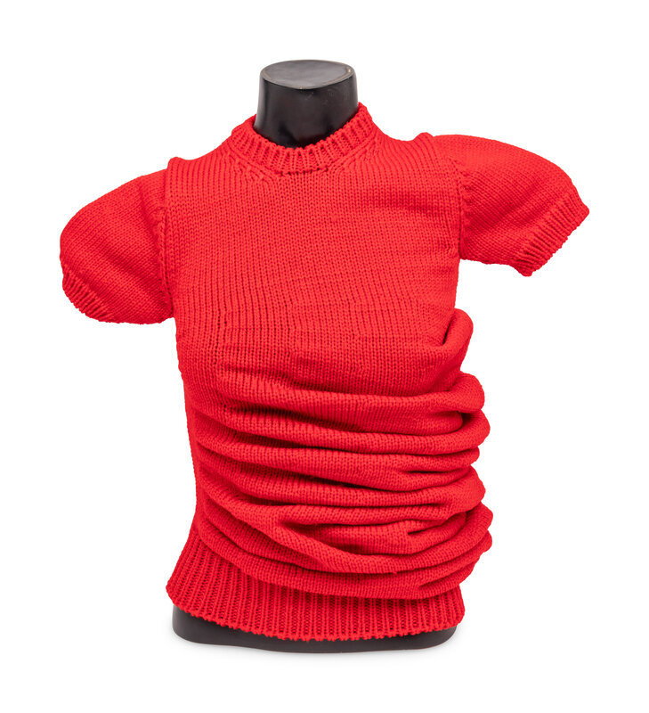 Curved/C-shape short sleeve sweater in scarlet knitted nylon. Some stretch content. Gathers into folds on along side of the torso when worn on the body. Unlined.