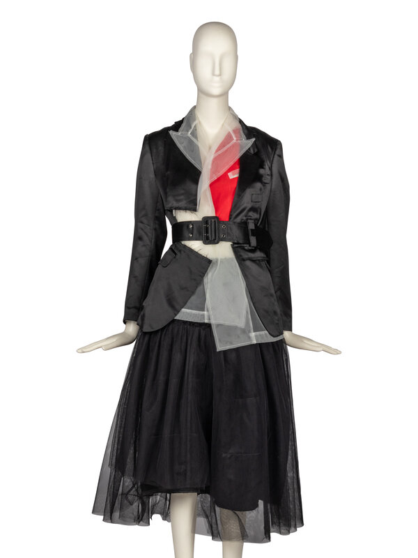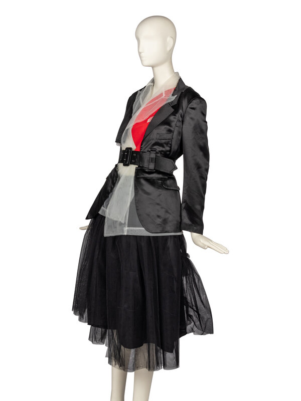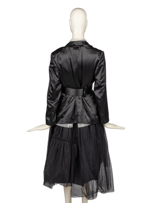 Double-layered suit jacket: outer layer jacket in black silk charmeuse, base layer jacket in white nylon tulle with large red flocked circular patch at front chest. Notch lapels. Three welt pockets at front, on both jackets. Outer jacket is slashed at the waist on one side. Removable belt closure.