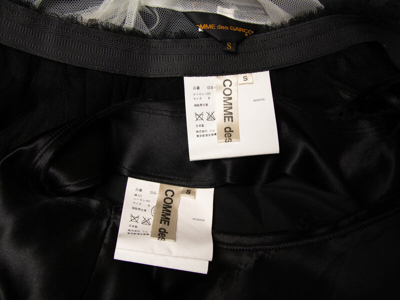 Layered midi length skirt in sheer black nylon tulle. Gathers throughout. Asymmetric tiers and hemline. Black jacquard waistband with hook-and-eye closures. Unlined.