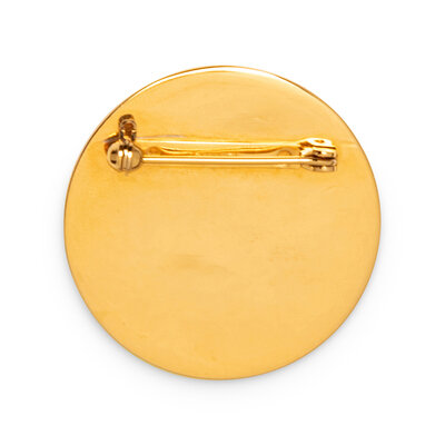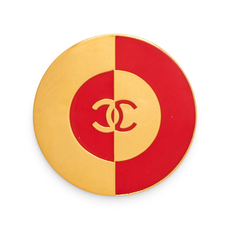 Circular brooch in gold-tone metal and red enamel. Features CC logo at center. Standard pin back closure.
