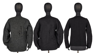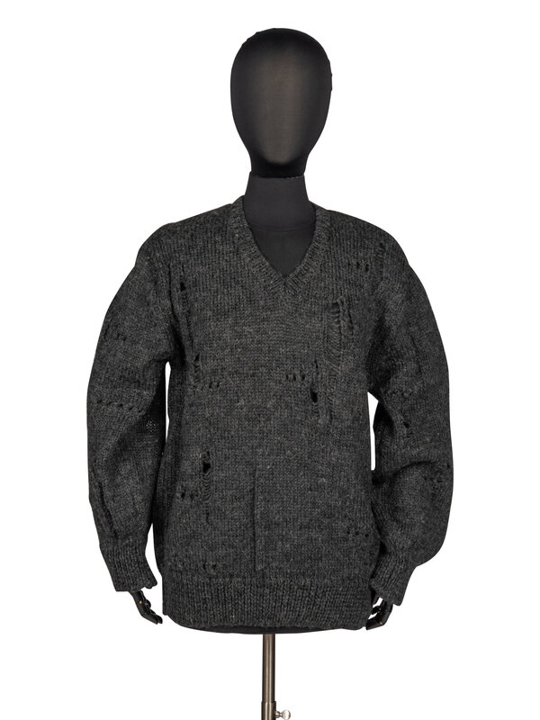 Men's sweater in dark grey wool knit. Heavy distressing throughout.