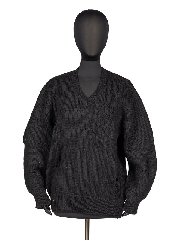 Men's sweater in black wool knit. Heavy distressing throughout.