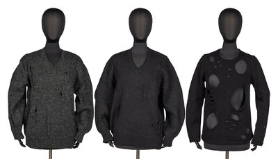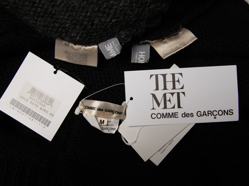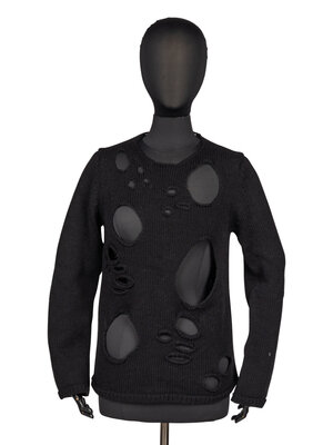 Sweater in black wool knit with various sized holes at the front of the bodice. This sweater was designed exclusively for The MET's 2017 exhibition, Rei Kawakubo / Comme des Garçons: The Art of In-Between. Includes all original retail tags.