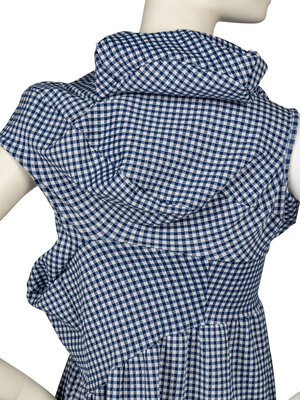 Midi length sleeveless dress in blue gingham polyester/nylon-blend knit jacquard. Cowl neck-effect. Some stretch content. Features asymmetric piecing at bodice with various "bumps" that form around the upper body. Unlined.