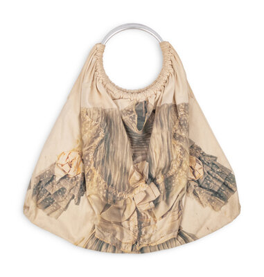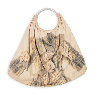 Sack bag in natural canvas; both sides of exterior printed with an image of a wedding dress. Large silver-tone metal O-ring handles. No closures. Lined in off-white cotton.