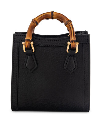 Diana Super Mini Bag in Black Grained Leather with Gold-Tone and Bamboo Hardware. Bamboo Top Handles and Removable Gold-Tone Chain Strap.
