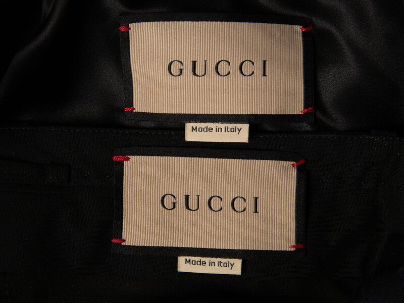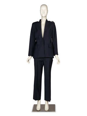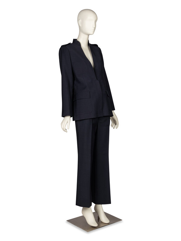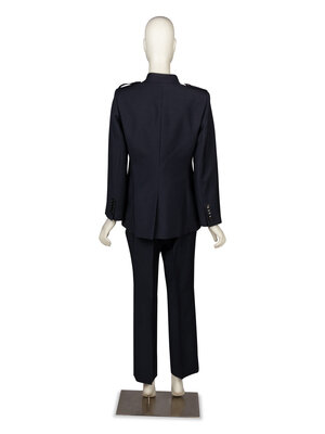 Tailored suit jacket in navy blue mohair/wool-blend suiting fabric. Mandarin collar, no lapels. Buttoned epaulette tabs at shoulders. Padding at shoulders. Decorative button faux-closures at cuffs. Two patch pockets with flaps at front hips; two patch pockets at upper chest. Decorative pick stitching throughout. Concealed button closures at front. Fully lined in black silk charmeuse.