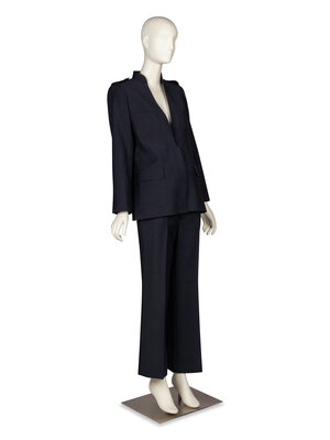 Suit trousers in navy blue mohair/wool-blend suiting fabric. Pressed pleats at both legs. Two inset pockets at hips. Two buttoned welt pockets at back. Belt loops at waist. Fly zipper, button, and hook-and-bar closures at front. Unlined.