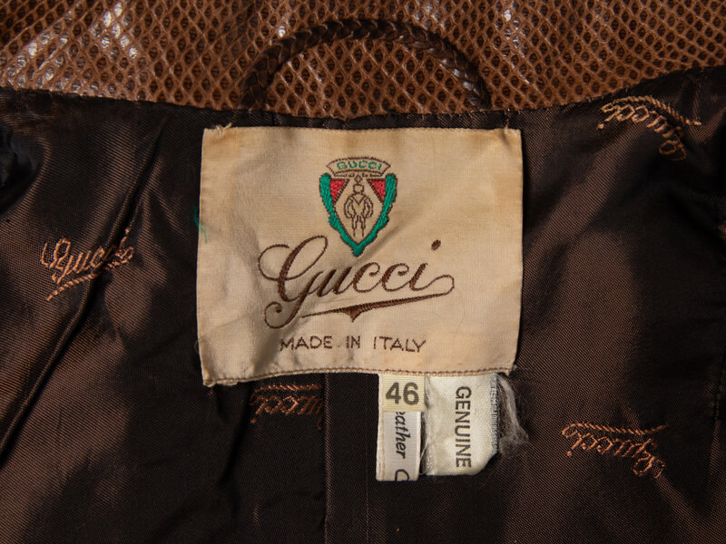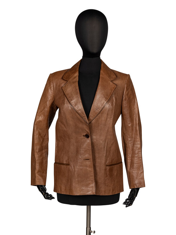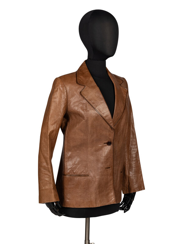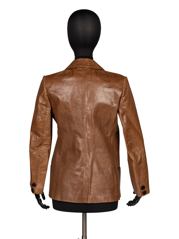 Single breasted jacket in brown snakeskin with brown leather piping trim. Wide notched lapels. Light padding at shoulders. Wrist length inset sleeves with decorative buttons at sleeve hems. Two welt pockets at front. Two button closure at front with wooden buttons. Fully lined in brown silk jacquard.