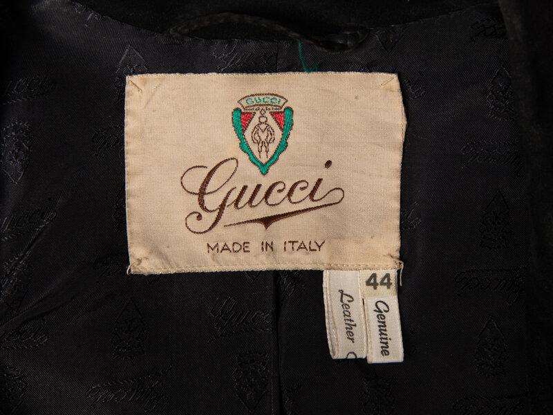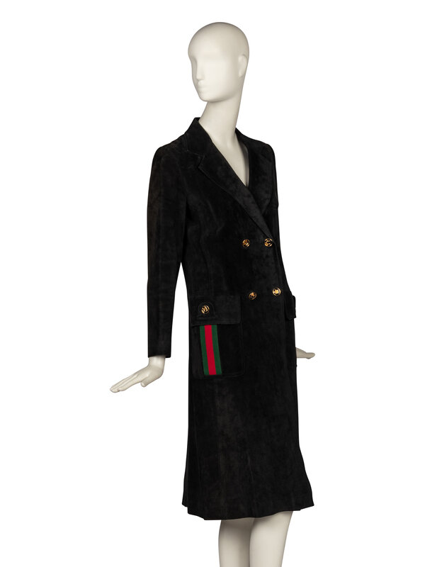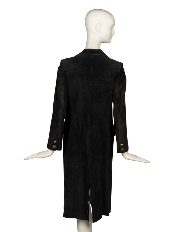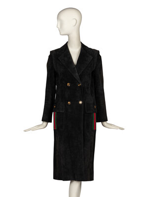 Knee length coat in black suede. Wide notch lapels. Wrist length inset sleeves with decorative buttons at sleeve hems. Two patch pockets with buttoned flaps; red and green striped jacquard ribbons at both pockets. Slit at back hem. Double breasted button closures at front. Fully lined in black silk jacquard.