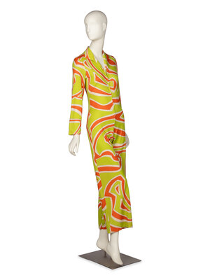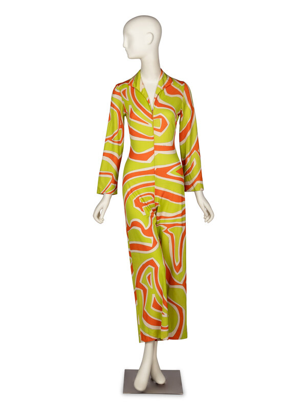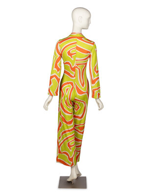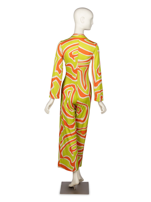 Fitted jumpsuit in orange & green printed silk jersey knit. Some stretch content. V-neckline with spread collar. Full-length sleeves. Straight pant legs. Zipper closure at front of bodice. Unlined.
