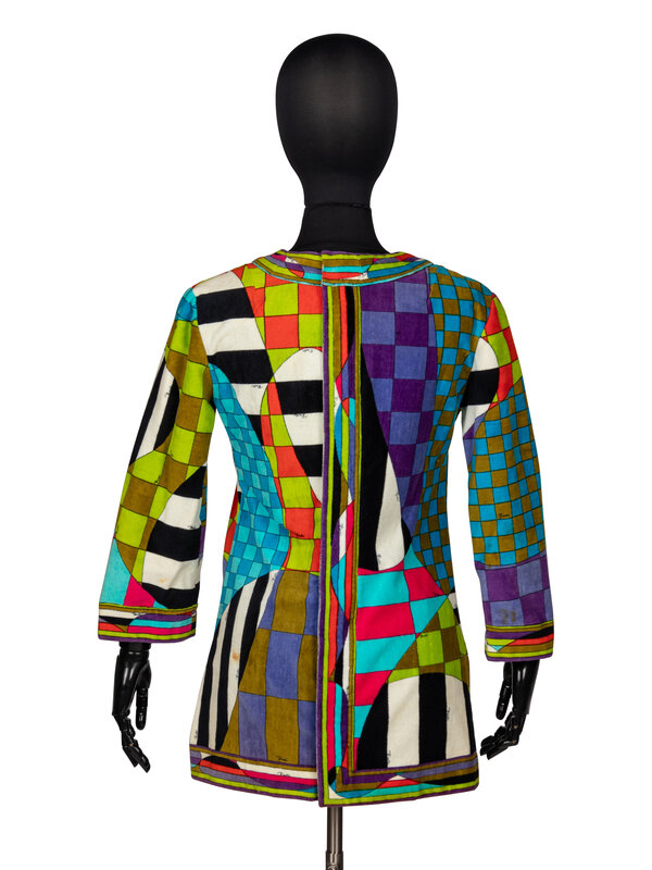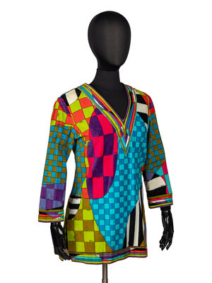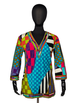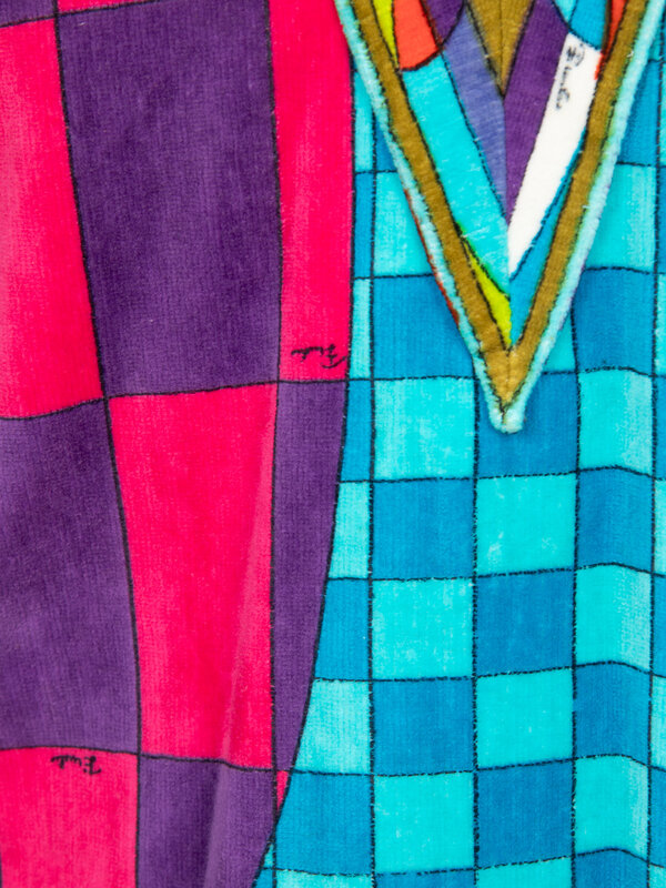 Tunic in multicolor printed cotton chenille toweling; features an all-over checkered "Pucci" print. V-neckline. Wrist-length sleeves. Slits at hem side seams. Separating zipper closure at back bodice; snap closures at back neckline. Unlined.