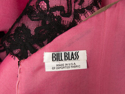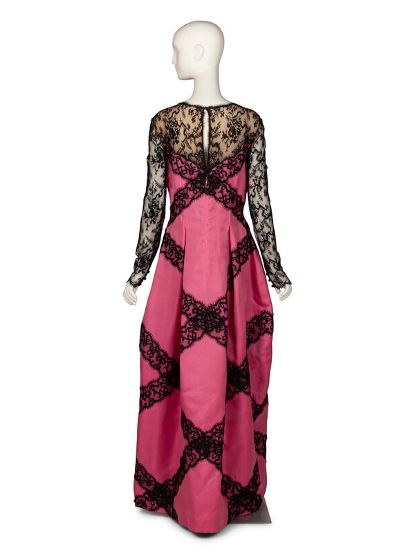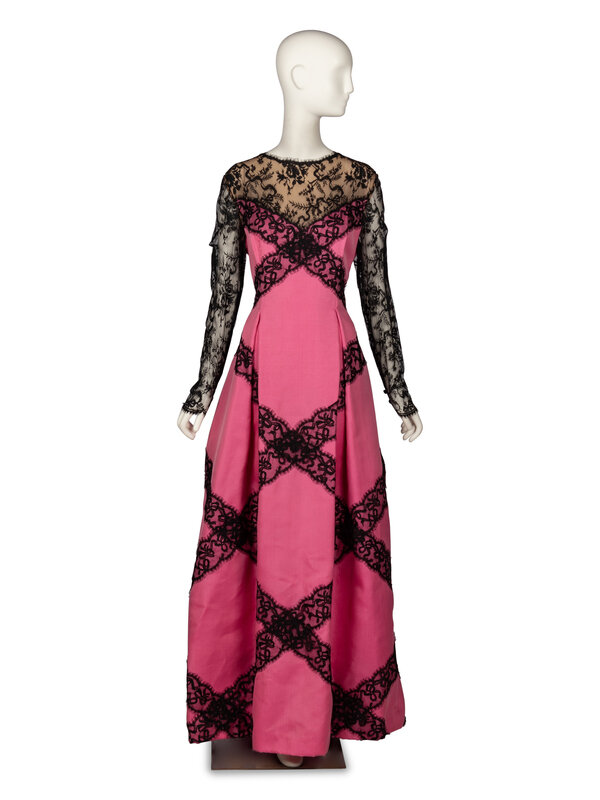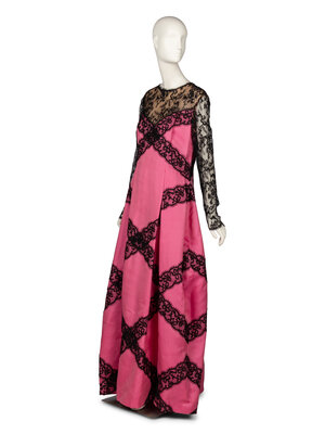Ball gown in pink silk broadcloth and black lace. Upper bodice in black lace with a beige silk chiffon underlayer. Long sleeves in lace with button closures at both sleeve hems. Flared bell skirt with deep box pleats; crisscrossing lace appliqués throughout skirt. Loop and button closure at back neckline; invisible zipper and hook-and-eye closure at back bodice. Fully lined.