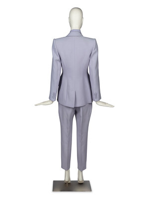 Tailored suit trousers in lavender wool/silk/nylon-bend suiting. Slightly cropped ankle length. Slit pockets at side seams. One welt pocket at back. Button, hook-and-bar, and fly zipper closure at front. Pressed crease in pant legs. Unlined.