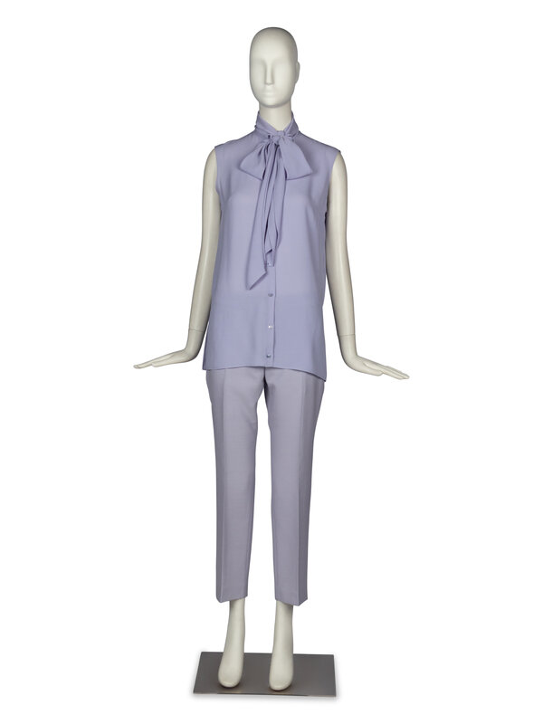 Sleeveless pussy bow blouse in lavender silk crêpe. Button closures at front. Unlined.