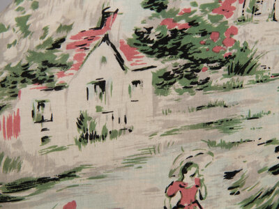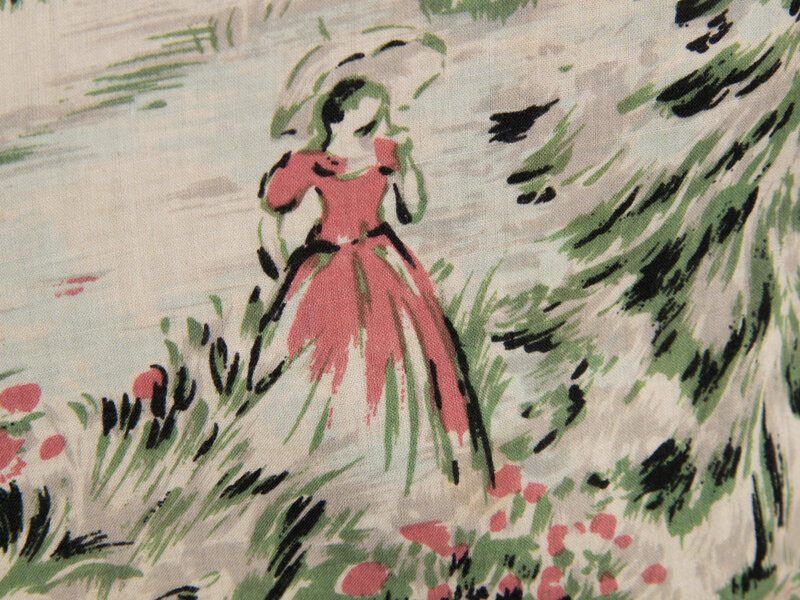 Cut-out parachute dress in 1940's-esque floral toile printed cotton. Round neckline; sleeveless. Cut-outs at waist, hips, and back. Layered ankle-length skirt. Cream-colored parachute straps throughout to enable ruching throughout to create volume. Features two large hanging pocket bags at hips with removable padding. Invisible zipper closure at back waist. Unlined.