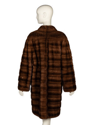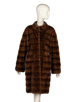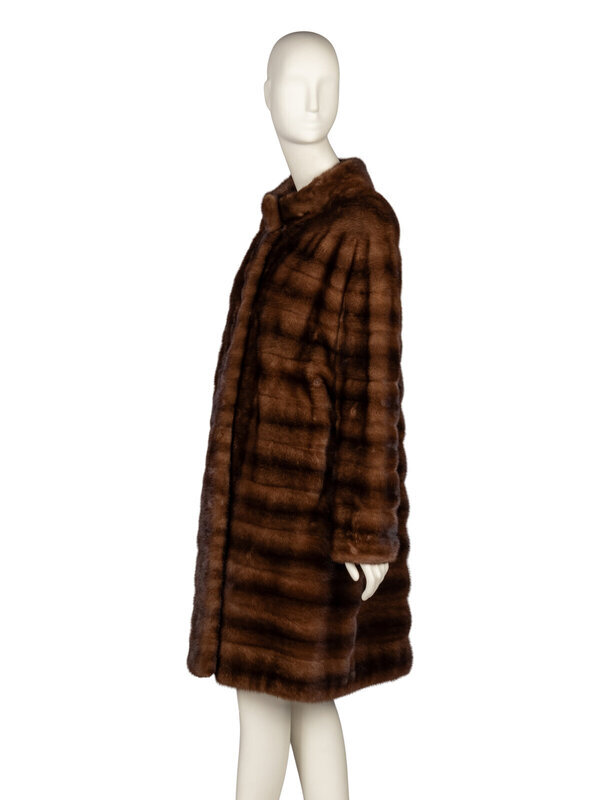 Knee-length coat in mahogany mink fur. Stand collar. Incorporated full-length sleeves. Two slit pockets at front. Three hook-and-eye closures at front. Interior ties at waist. Fully lined.