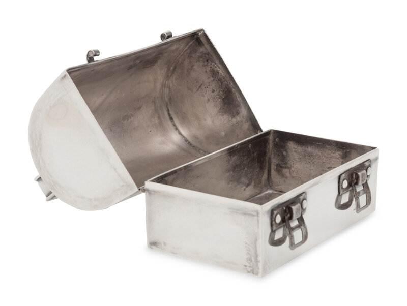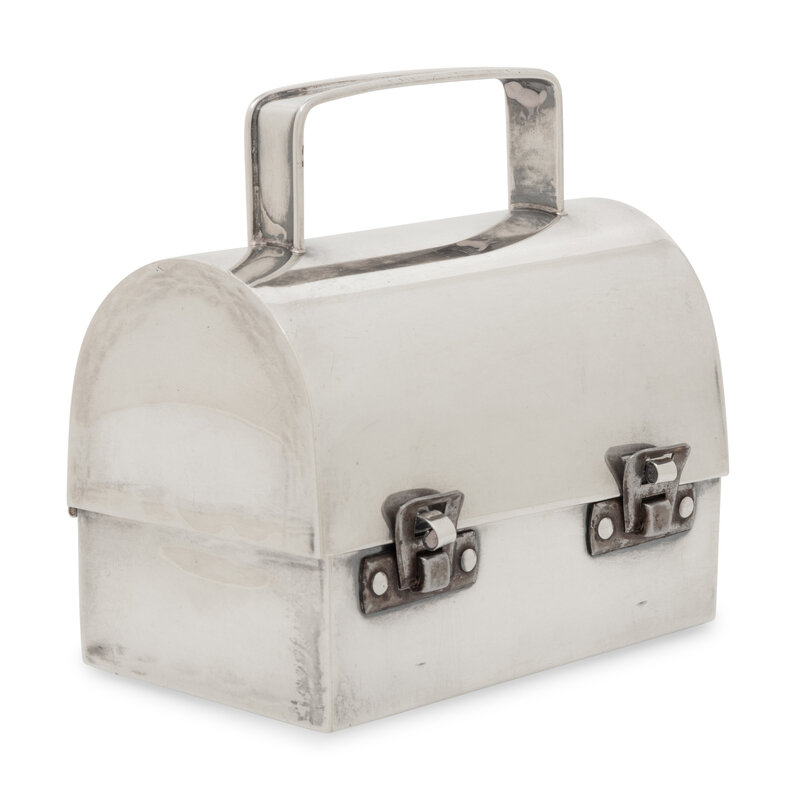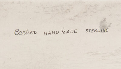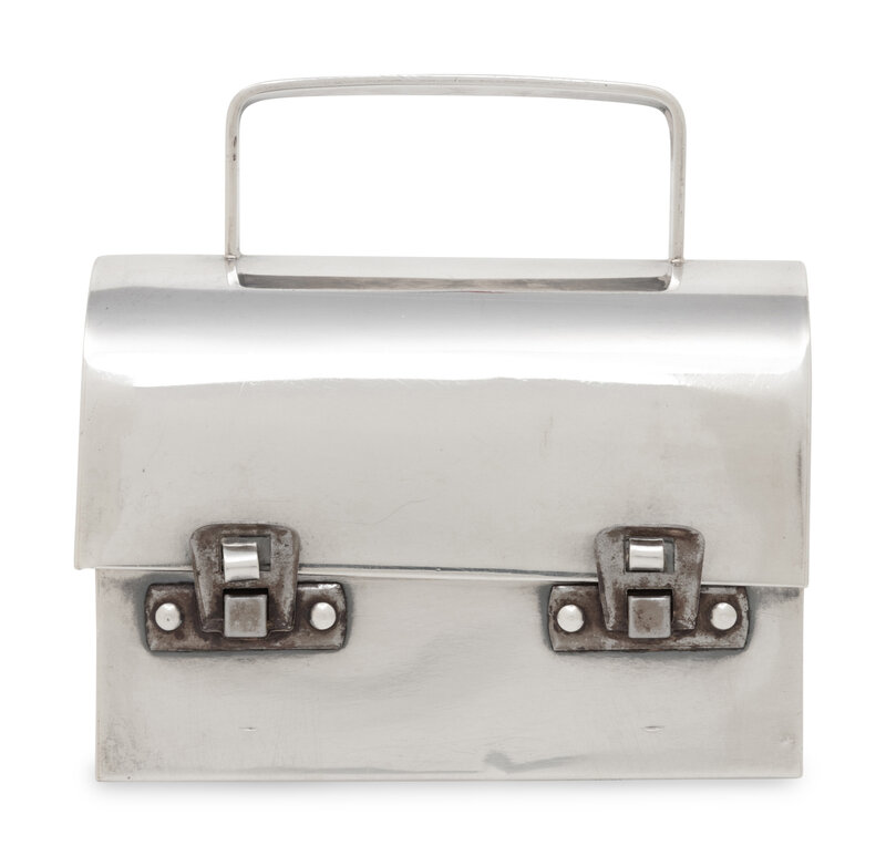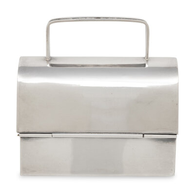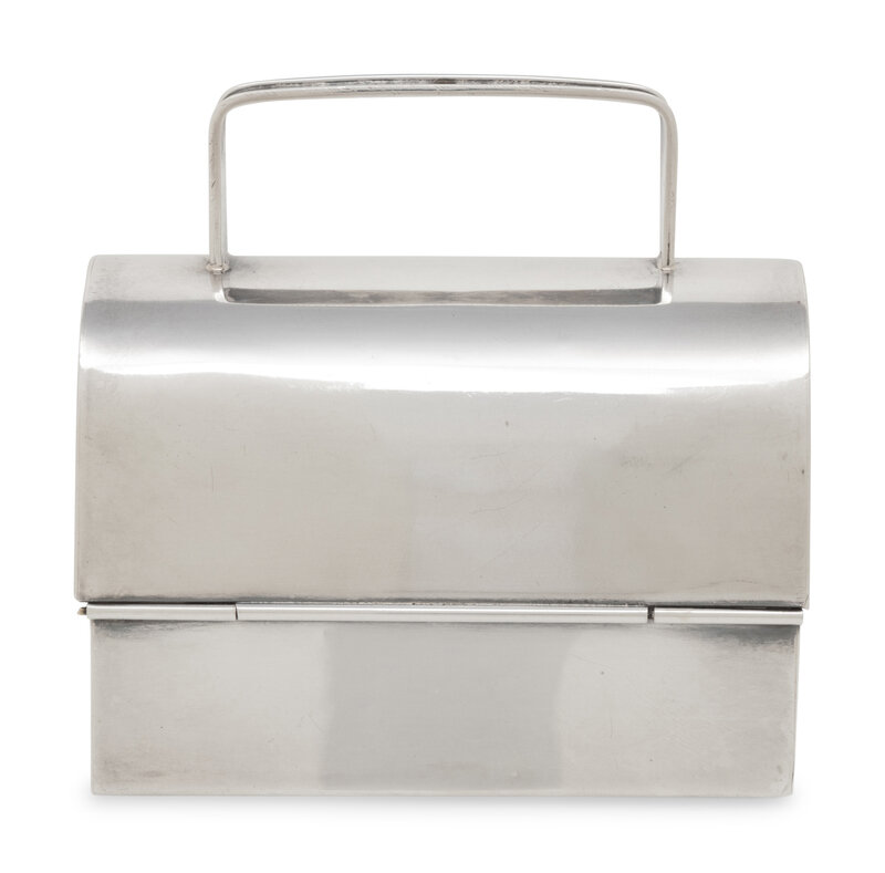 Box evening bag in sterling silver with a top handle, domed hinged lid, and two latch closures at front. Stamped "Cartier HAND MADE STERLING" at base.
