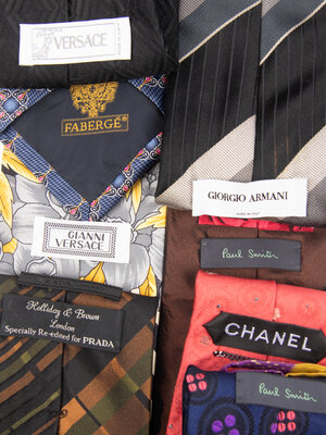 Lot comprised of eight designer neckties, including the following brands: Versace (2), Fabergé, Paul Smith (2), Prada, Giorgio Armani, and Chanel.