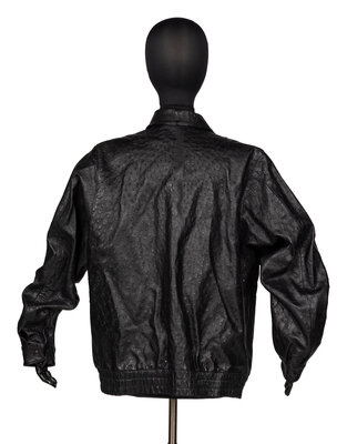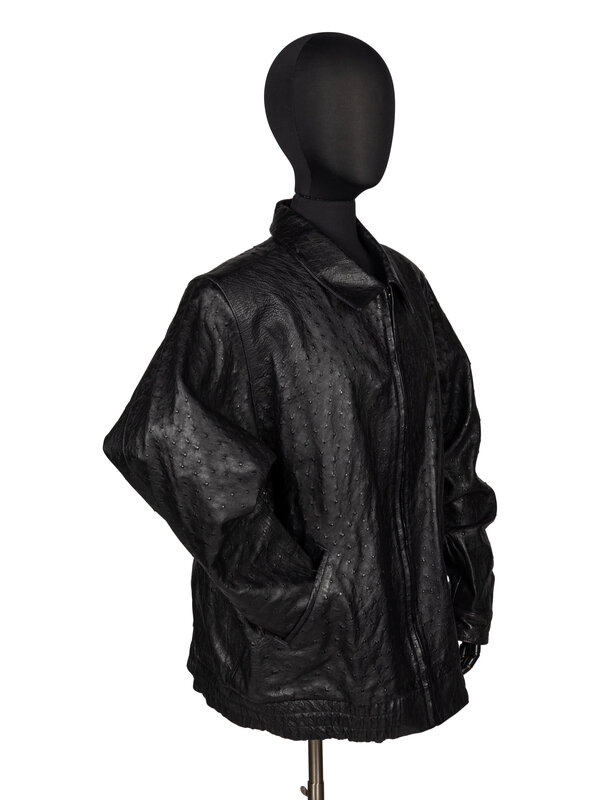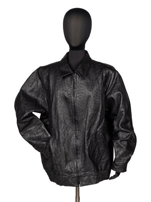 Men's blouson jacket in black ostrich skin leather. Spread collar. Full-length sleeves with snap-button cuffs. Two welt pockets at front; one welt pocket at interior. Elasticated hem. Zipper closure at front. Fully lined.