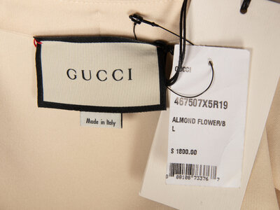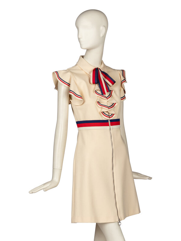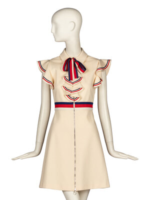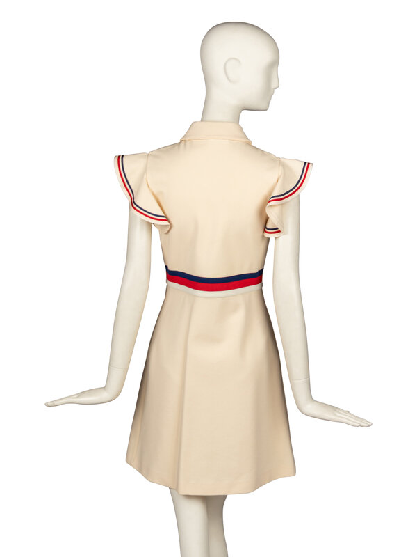 Knee length shirt dress in cream stretch-blend knit with navy, red, and white appliquéd ribbon trim throughout. Shirt collar with flounces at front and attached grosgrain ribbon neckties. Flounced petal sleeves. Striped ribbed knit panel waist. Exposed double-ended metal zipper closure at front of dress. Unlined.