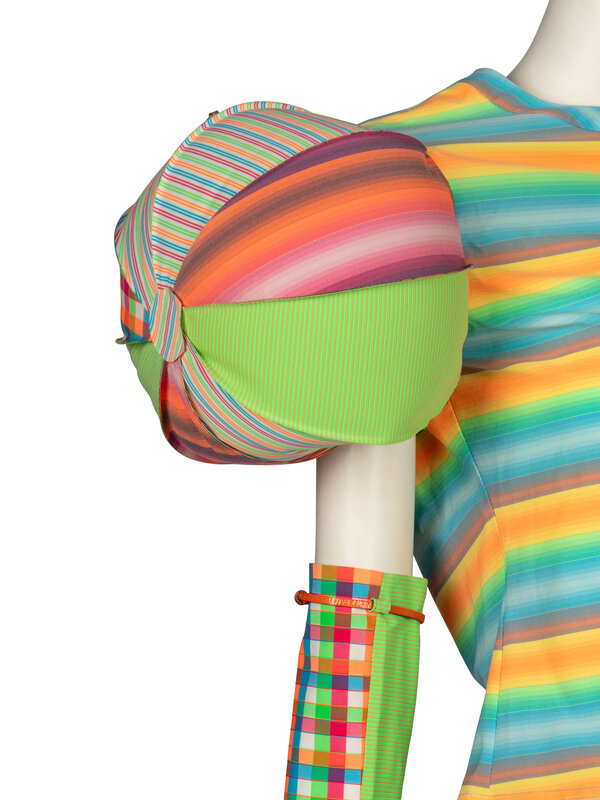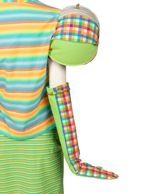 Pneumatic-sleeve shirt in a variety of multicolor printed stretch-blend knit fabrics. Round neckline. Pieced sleeves with plastic nozzle on both sleeves for inflating. Zipper closure at front with padded zipper pull. Partially lined.