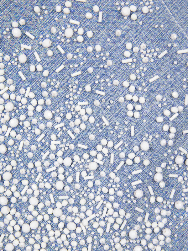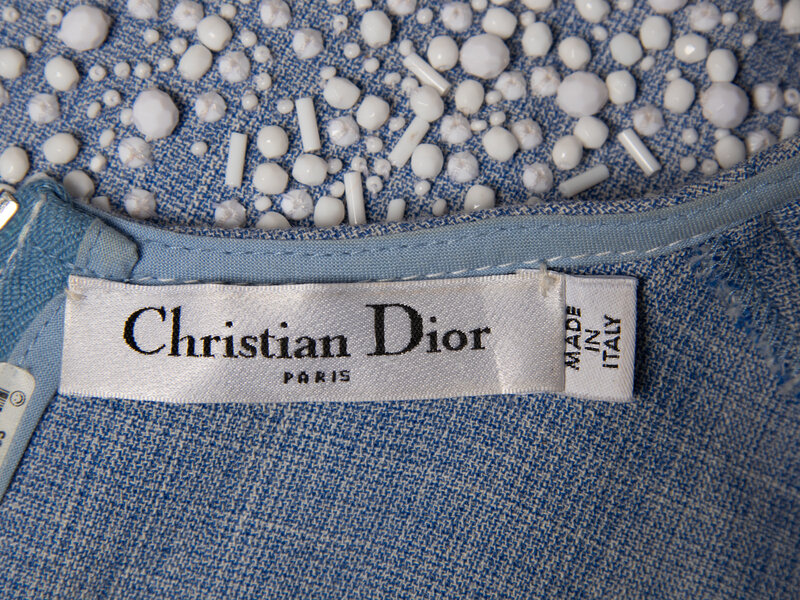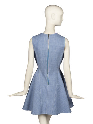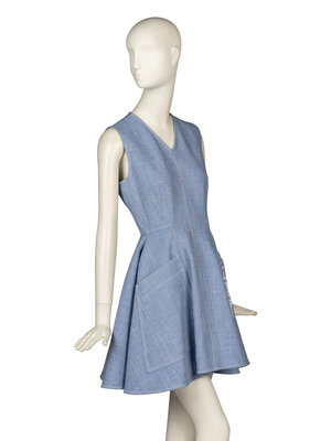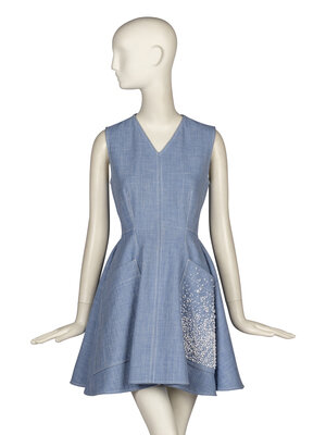 Dress in viscose/cotton/wool/nylon-blend chambray. Collarless V neckline. Sleeveless. Above-knee length circle skirt. Two large patch pockets at front of skirt with white bead embellishments on one pocket. Exposed metal zipper closure at back. Unlined.