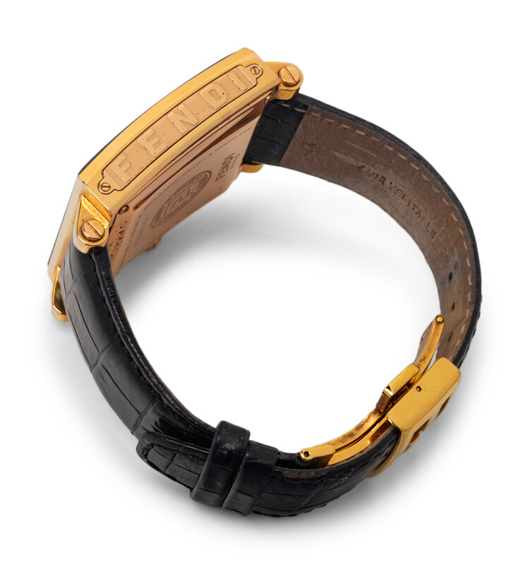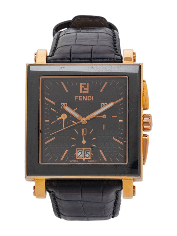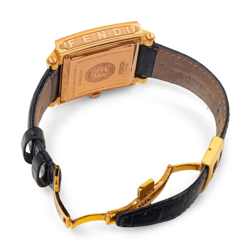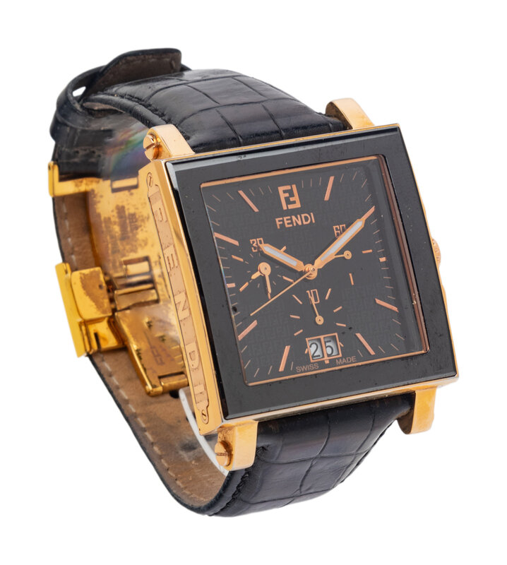 "Quadro" watch with black embossed leather band. Gold-tone stainless steel hardware with black enamel accent. Square black watch face with gold-tone details and multiple dials & date. Butterfly clasp at band interior.